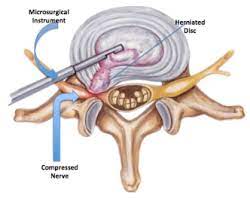 Discectomy is surgery to remove lumbar (low back) herniated disc material that is pressing on a nerve root or the spinal cord. It tends to be done as microdiscectomy, which uses a special microscope to view the disc and nerves. This larger view allows the surgeon to use a smaller cut (incision). And this causes less damage to surrounding tissue.